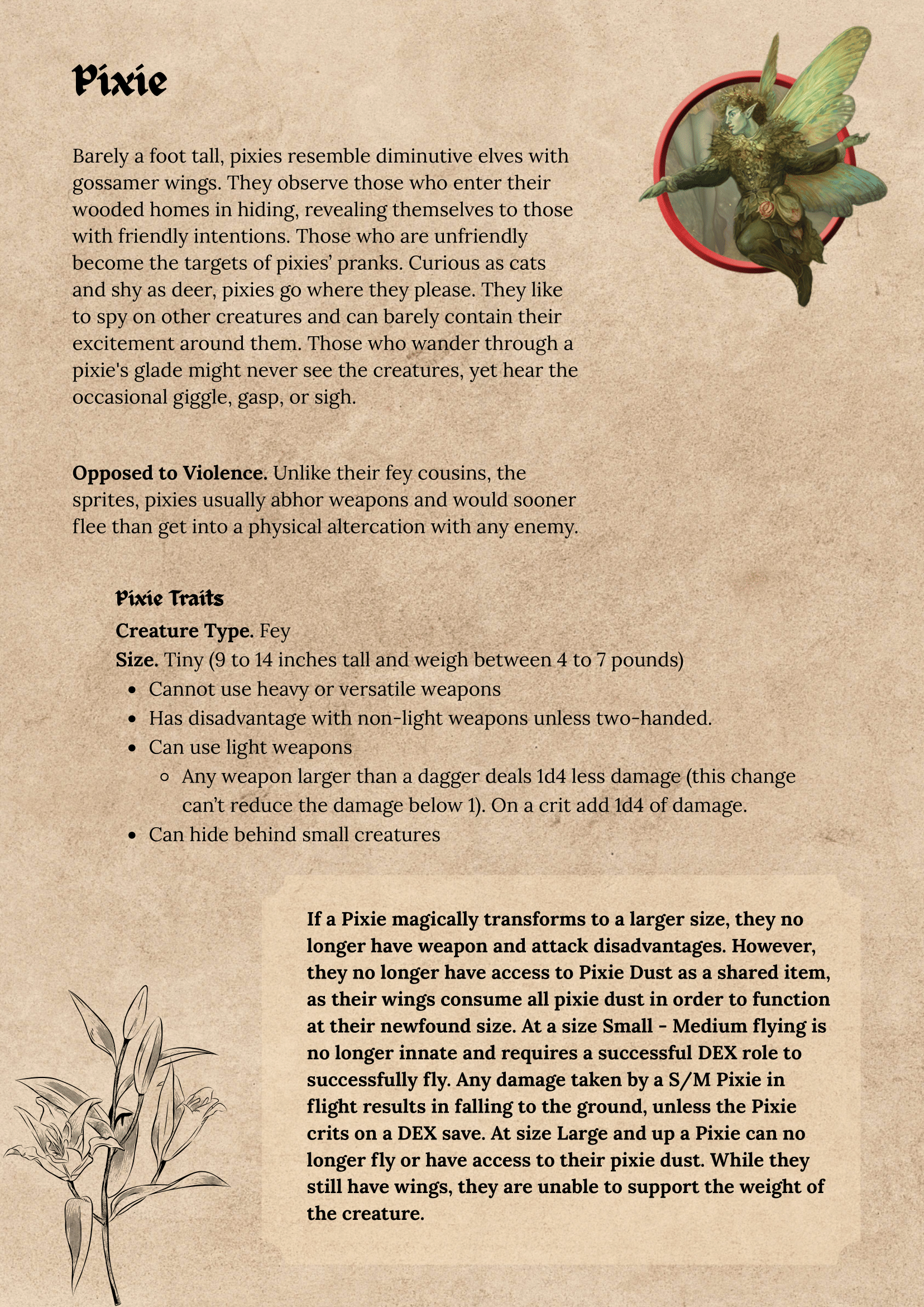 I took time to consider ways to give this species applicable fey magics as well as provide realistic mechanics for their stature in a way that didn’t feel like punishing the player, but rather gave them a realistic feeling of playing a tiny character. I also wanted there to be repercussions if the player was to pursue becoming a larger creature, leaving behind Pixie Nimbleness in pursuit of their alternate goals, in a way that acknowledges and respects that when your body changes it acts differently.